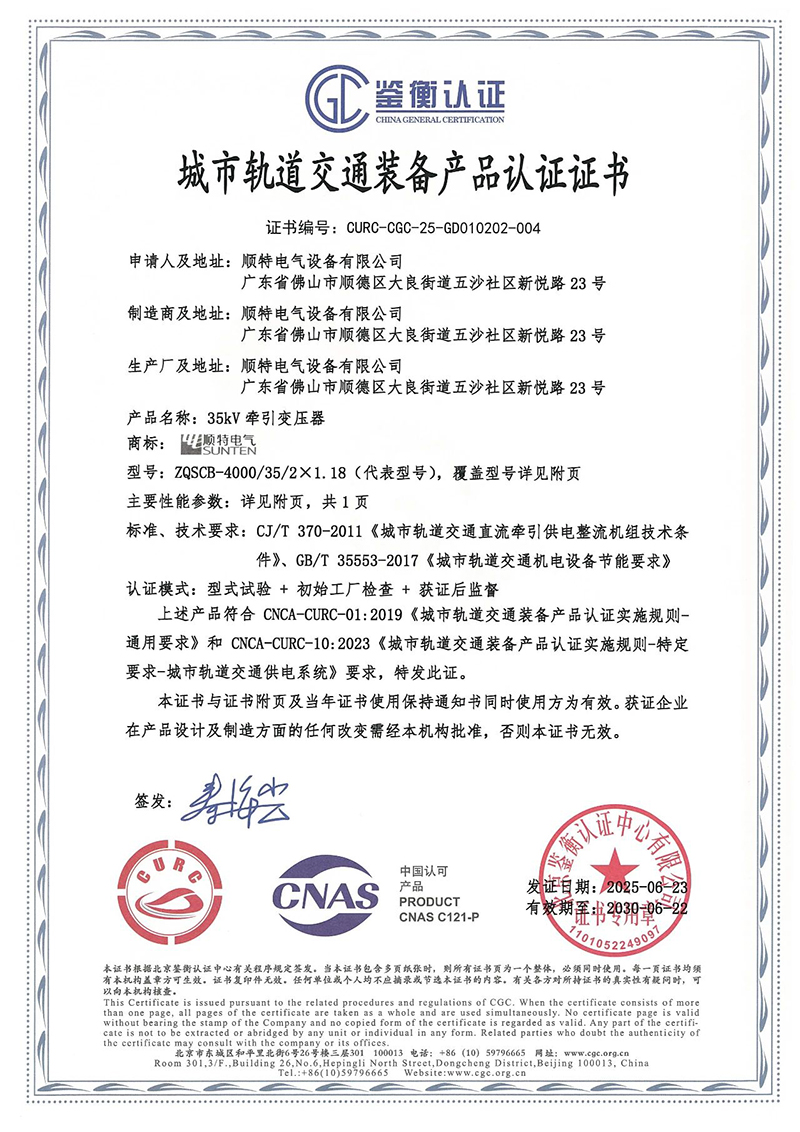 CURC產(chǎn)品認證是由國家認監(jiān)委批準的針對城市軌道交通裝備產(chǎn)品的認證體系,旨在提升產(chǎn)品質量安全水平。本次通過認證的35kV牽引變壓器覆蓋容量范圍從1600kVA至4000kVA,滿足CJ/T 370-2011《城市軌道交通直流牽引供電整流機組技術條件》和GB/T 35553-2017《城市軌道交通機電設備節(jié)能要求》的標準、技術要求。