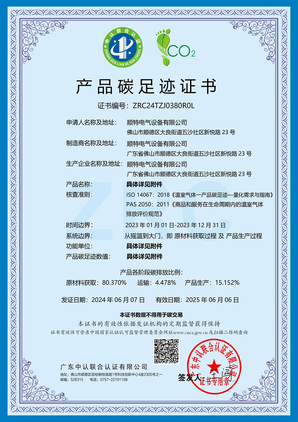 順特電氣設(shè)備有限公司取得產(chǎn)品碳足跡證書
